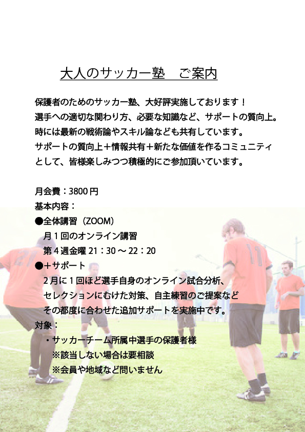 「大人のサッカー塾」保護者の方に大好評を受けて、コーチ向けカテゴリーも開講します!ぜひご参加・ご体験を!!